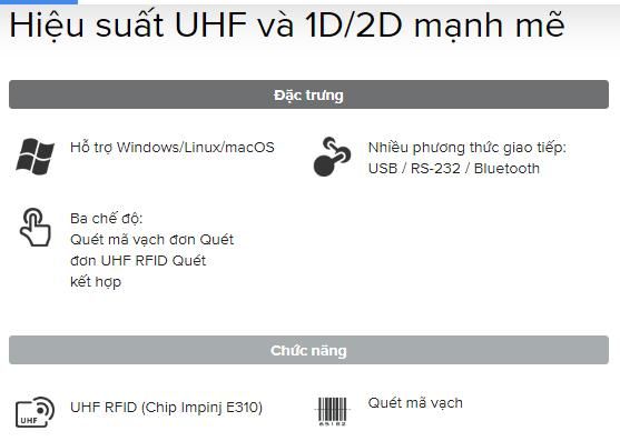 - Khả năng giải mã: 1D,2D và UHF